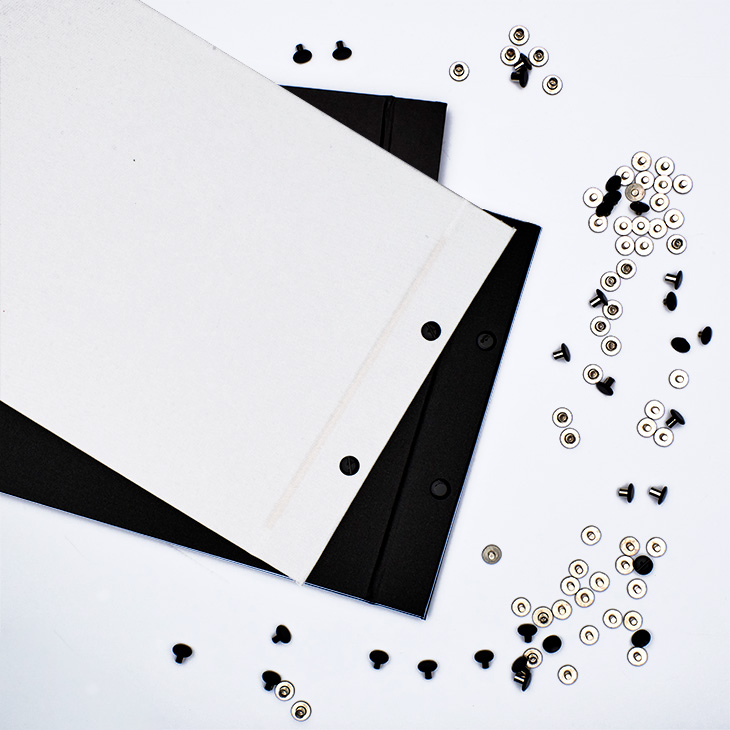 Die Buchschrauben drehen wir in die vorhandenen Löcher Ihres Druckproduktes. Diese unkomplizierte und stilvolle Bindung ermöglicht Ihnen, auch zu einem späteren Zeitpunkt selbst Seiten auszutauschen und zu ergänzen. Verwendung finden Sie oft in Speisekarten, Mustermappen und -fächern oder bei klassischen Karten oder Alben. Die Buchschrauben bestehen aus einer glatten Hülsenmutter und einer Schlitzschraube. Diese werden ineinander gedreht, um das Loseblatt zu binden. Mit einem handelsüblichen Schraubenzieher lassen sich die Buchschrauben lösen und wieder fest verschrauben. Der Schaftdurchmesser beträgt 5 mm. Die Schafthöhe richtet sich nach der Dicke der zu bindenden Blätter. Wählen Sie zwischen Metallschrauben in neutralem Silber oder schwarz lackiert aus vernickeltem Stahl aus.